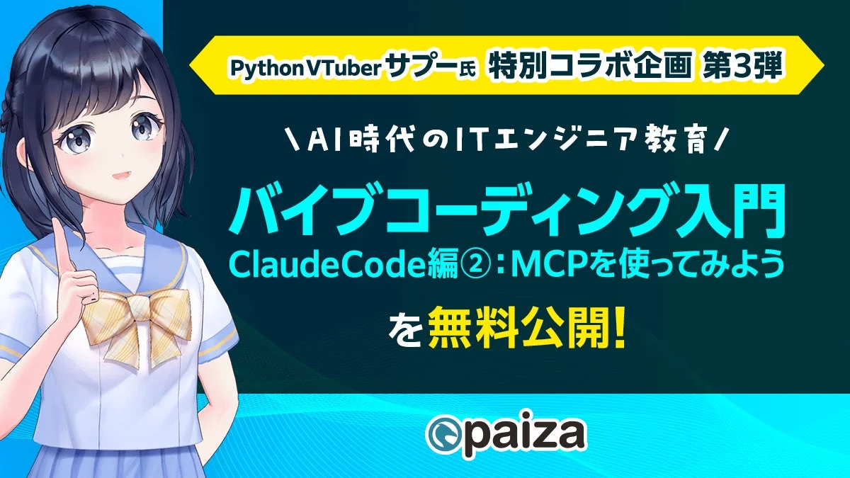 講座を担当するPython VTuber サプー氏からは、「コラボ第3弾となる本講座では、Claude CodeとMCPサーバの連携方法を初心者向けにわかりやすく解説しています。最近のAIエージェントは外部ツールとの接続やドメイン知識の取り込みなど、AIをより実用的に活用するための機能が次々と登場しています。中でも MCP(Model Context Protocol) は、AIと外部システムをシームレスにつなぐことで、より高い拡張性を実現する技術です。本講座では、MCPサーバの基本的な考え方から実際の導入方法までを丁寧に解説しています。AIエージェントをより便利に使いたい方は、ぜひ本講座を通じてMCPサーバの導入に挑戦してみてください。」とコメントが寄せられています。